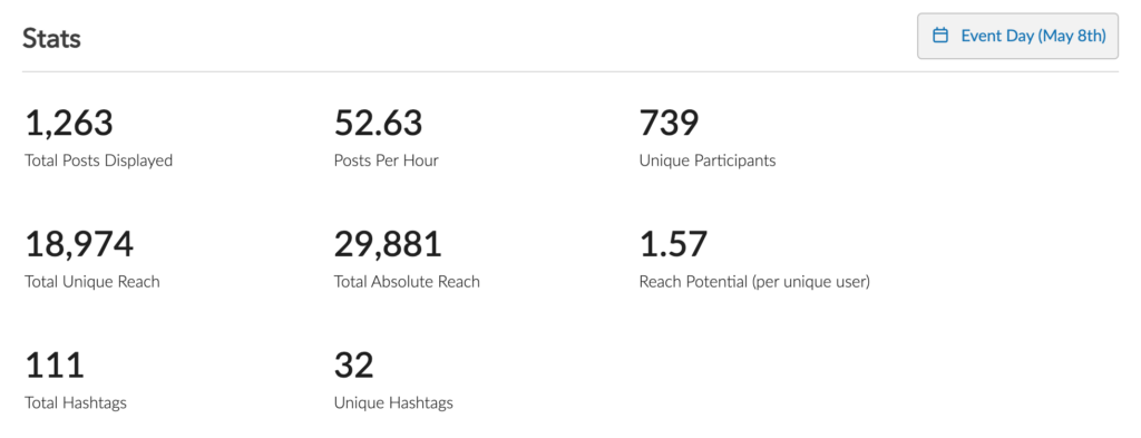 - Engagement rate: Do you know how engaged people were on social media for your event? You can see the total number of posts and divide that by the unique participants to see the engagement rate (another stat that Everwall provides).