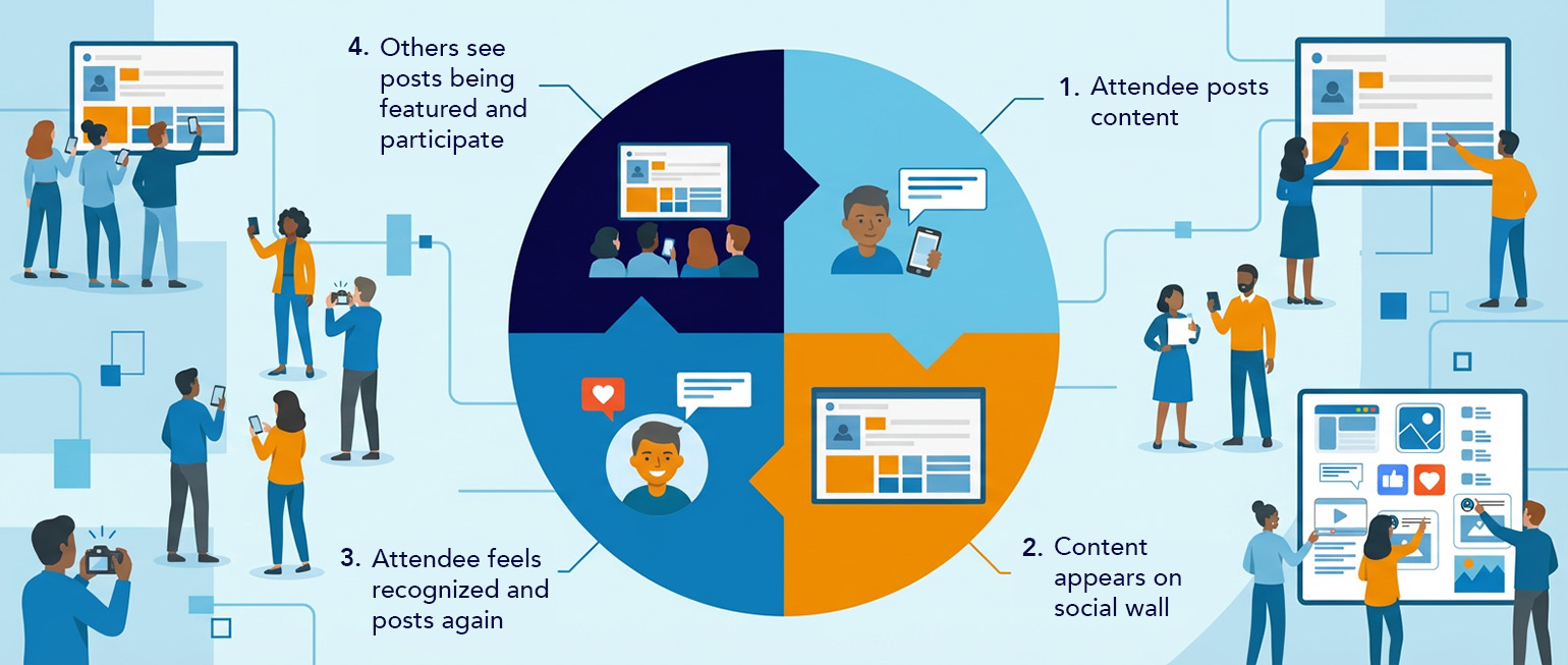A hashtag alone isn’t enough. People need to know their content will actually be seen. When someone posts using your event hashtag and then sees that post appear on screens throughout the venue, they’re likely to post again. They also tend to nudge the person next to them to participate.